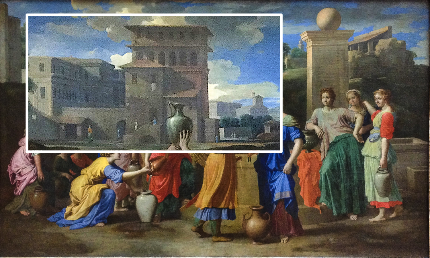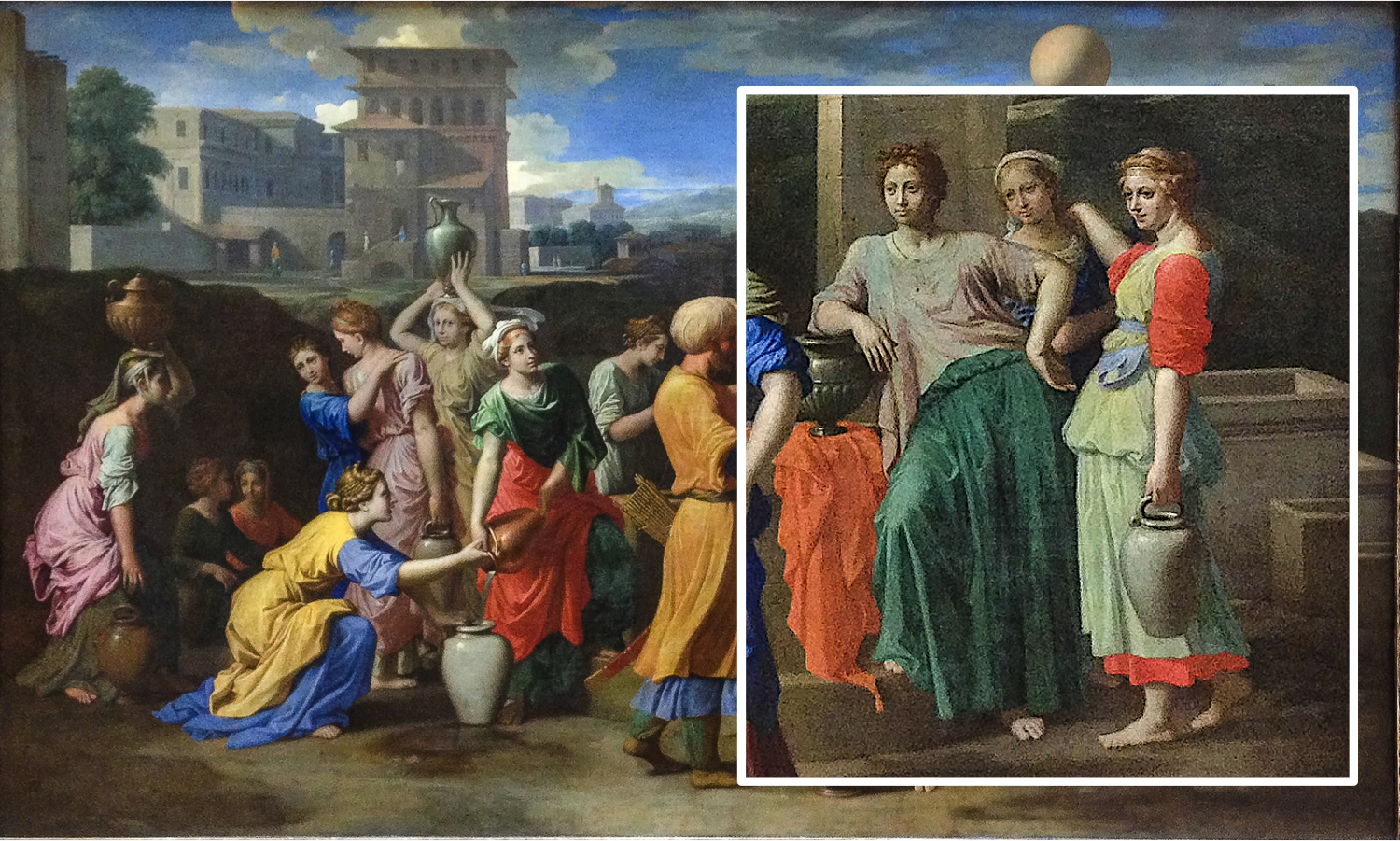Cette toile est commandée par Jean Pointel, un ami de Poussin qui a flashé sur La Vierge cousant avec ses compagnes de Guido Reni. Encore sous le choc, il réclame une toile avec « plusieurs filles, dans lesquelles on peut remarquer différentes beautés ». Poussin s’exécute. Dans la Genèse 24, il y a ce passage où Rebecca est choisie par Éliézer au beau milieu d’un groupe femmes. Dans cet instant – idéal pour présenter une guirlande de beautés – le peintre en profitera pour faire son clin d’oeil aux sculptures de l’antique et aux beautés modernes de Reni et